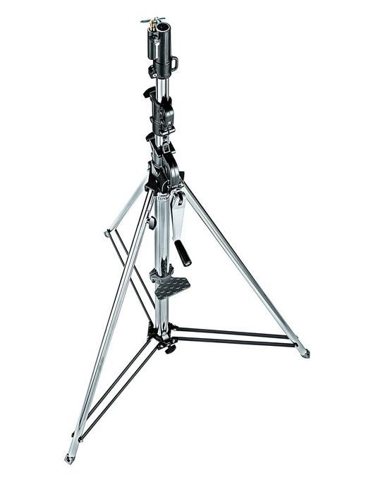 Manfrotto 087NW Wind-Up Stand este un stativ negru din trei sețtiuni, din oțel cromat, cu coloana zimnțată [geared column] și un picior de poziționare [levelling leg].