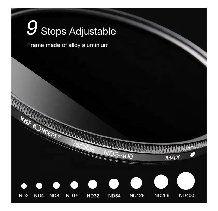 Acest filtru Variabil ND2-ND400 de la K&F Concept este un filtru de densitate neutra variabila ce ofera o reducere reglabila a luminii de la 1 la 8,6 trepte. Filtrul ND variabil intuneca uniform intreaga imagine, permitand realizarea unei fotografii cu o diafragma mai mare sau cu o viteza mai mica a obturatorului decat este necesar in mod normal. Prin incetinirea timpului de expunere sau cresterea diafragmei, este posibil sa controlati cu usurinta adancimea campului si sa estompati miscarea, creand un aspect dinamic pentru rauri, cascade, peisaje si multe altele.