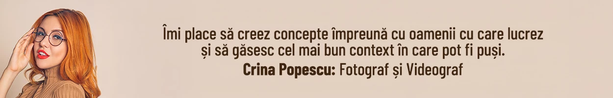 Crina Popescu este fotograf si editor, iar daca ar fi sa se descrie intr-un singur cuvant - ar fi “neconvențional”. Campaniile vizuale pe care le-a creat, au crescut branduri de succes. Pentru ea, reusita antreprenorilor cu care lucreaza, este dovada pasiunii cu care isi face meseria. Portofoliul sau cuprinde o gama variata de lucrari - de la fotografia de produs, fashion pana la personal branding.