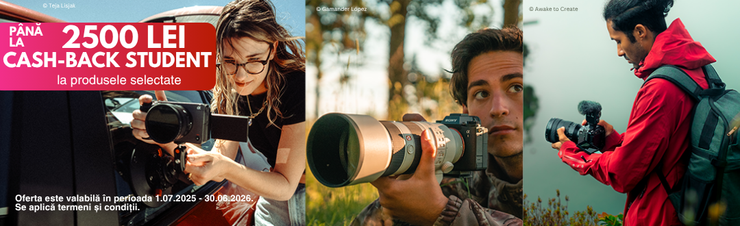 Pentru a veni in sprijinul studentilor care doresc sa creeze continut vizual, Sony ofera o reducere de pana la 2500 lei la achizitia aparatelor, obiectivelor sau accesoriilor mentionate mai jos.
