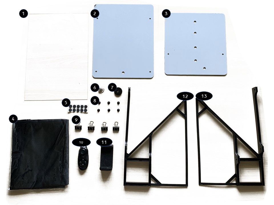 Instalarea Teleprompterului se face usor asa incat sa fie instalat de catre utilizatori fara experienta tehnica. Astfel, se monteaza scheletul cu nr 13 impreuna cu tablia nr 2, apoi scheletul cu nr 12 se ataseaza acestei tablii si se prind cu pinii de prindere nr. 8.