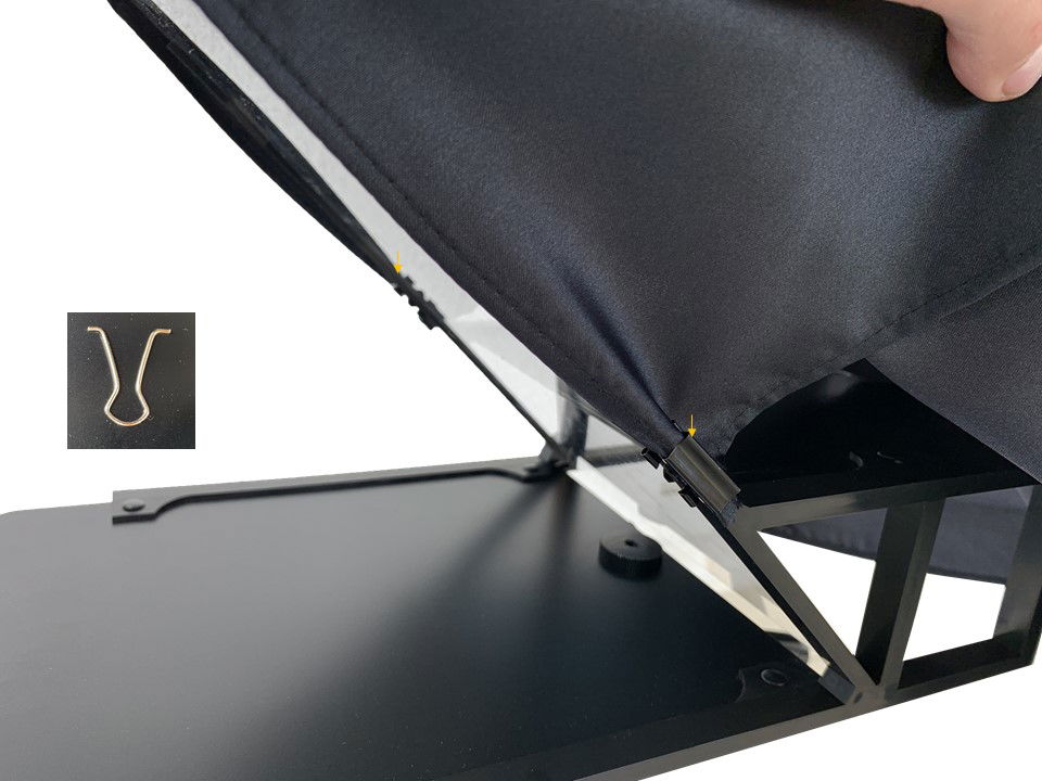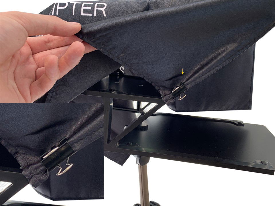 Se ataseaza ecranul reflectiv nr 1 in Teleprompter. Se ataseaza coverul negru nr 4 peste Teleprompter si se fixeaza cu doua clipsuri nr. 9.