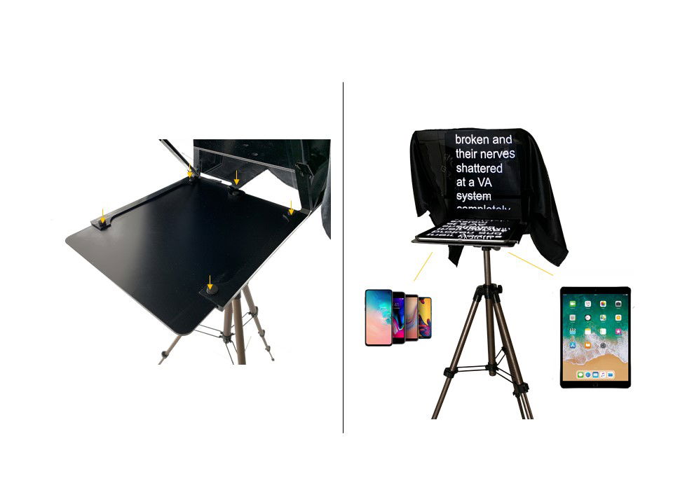 Acest teleprompter este compatibil cu dispozitive de inregistrare multiple: smartphone, camere de mici dimensiuni, pentru camere de mari dimensiuni este necesara utilizarea unui trepied separat pentru camera.