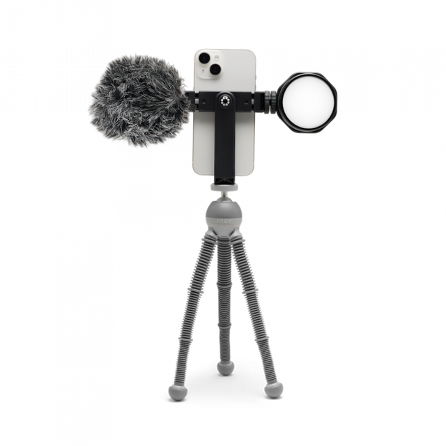 Kitul include 3 elemente esenţiale: trepied flexibil JOBY PodZilla Medium, microfon de vlogging Wavo Mobile şi lumină LED Beamo Reel. Trepiedul se poate fixa pe bare, stâlpi sau se poate aşeza pe birou pentru cadre creative; suportul pentru telefon permite orientare portret sau landscape; microfonul aduce audio mai curat decât microfonul intern al telefonului; şi lumina LED oferă control al temperaturii de culoare, reglaj al intensităţii şi montare facilă pe telefon sau rig‑mobil. Ideal pentru „creaţie rapidă” în deplasare sau într‑un studio mic.