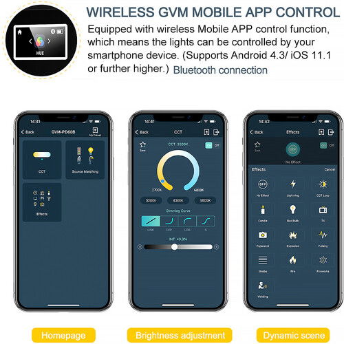 Un ecran integrat ofera un afisaj simplu, in timp ce un buton rosu asigura controlul direct al luminii. Foloseste aplicatia GVM pentru a controla PD60B de la distanta folosind smartphone-uri iOS sau Android. Este disponibila si reteaua Bluetooth mesh pentru controlul grupului de dispozitive GVM.