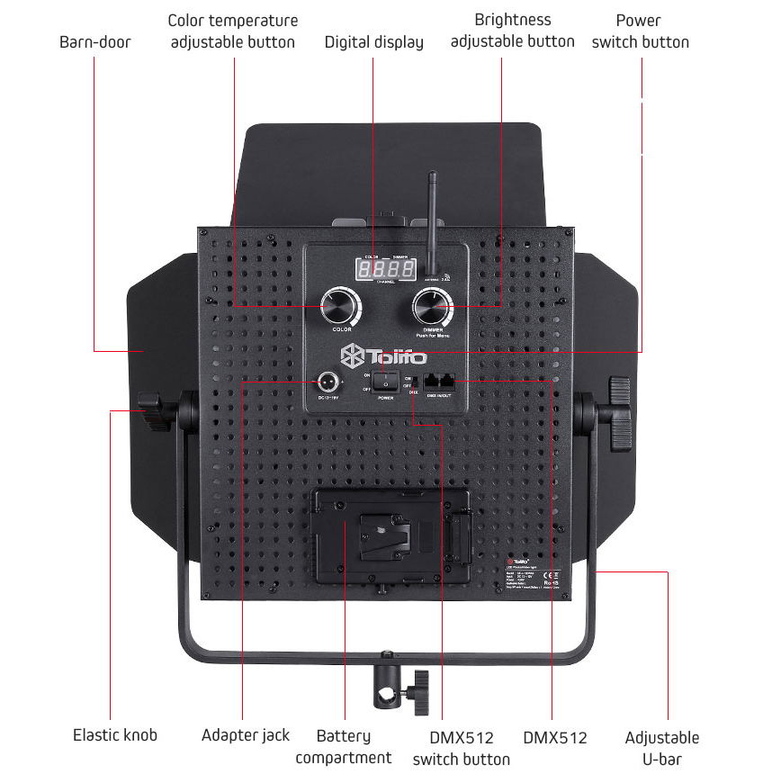 Controlul luminii se face pe spatele acestui panou, de asemenea, prezenta telecomenzii dar si a DMX-ului, permit controlul intensitatii luminii si a temeperaturii de culoare, la distanta.