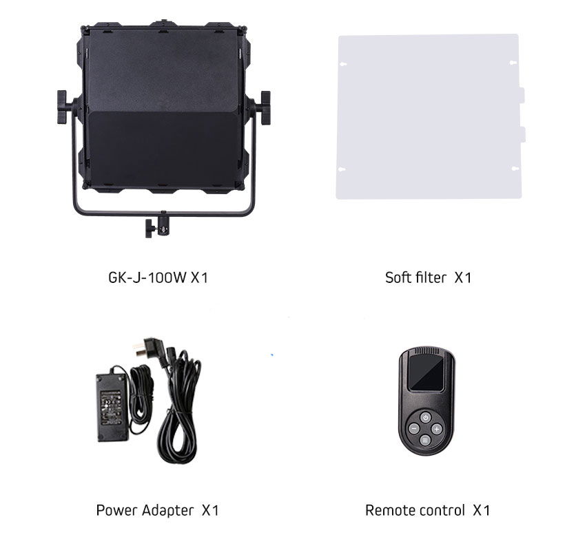 Lampa Video LED se livreaza impreuna cu voleuri si panou de difuzie, alaturi de cablu alimentare la priza si telecomanda (telecomanda nu include baterii).