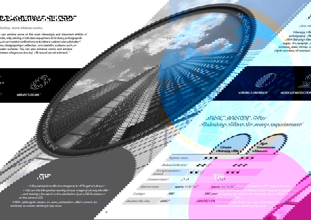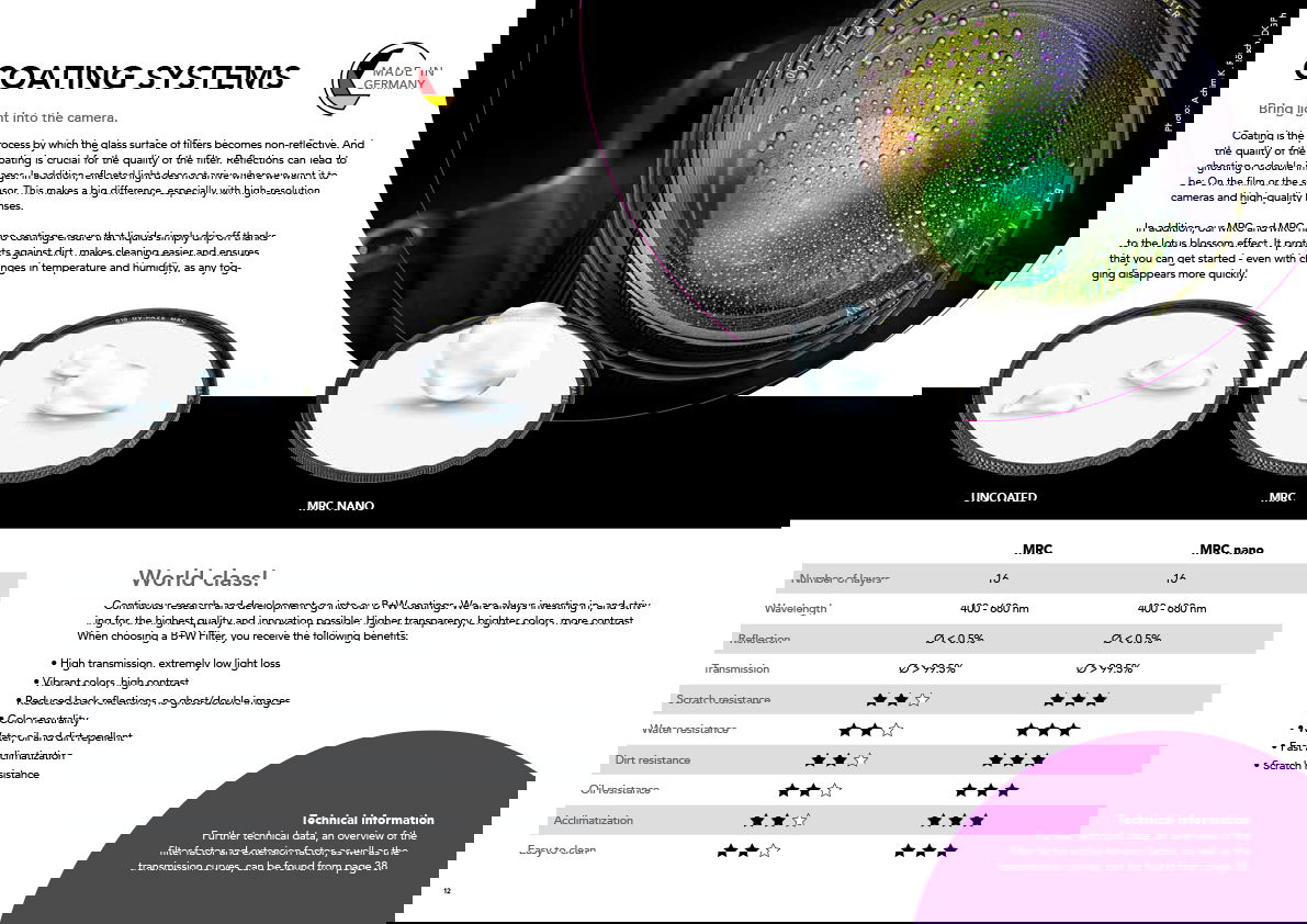 Schneider B+W este unicul producator de filtre din lume care a dezvoltat sistemul MRC Multi Resistent Coating, un tratament multilayer in 16 straturi ce produce o antireflexie perfecta, culori stralucitoare si contrast ridicat. In plus ofera protectie fata de zgarieturi si o curatare mai usoara de apa, ulei sau praf.