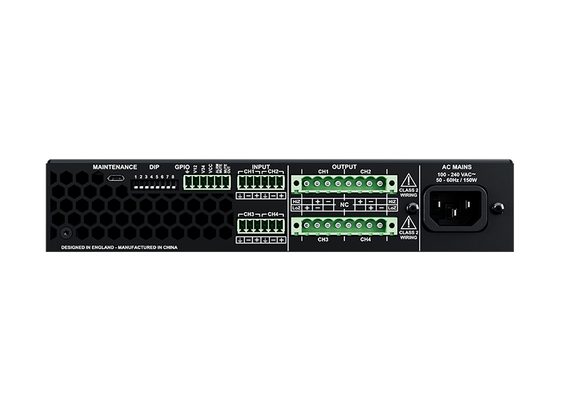 Acest amplificator de clasa D poate alimenta atat incarcari de impedanta joasa (4Ω–16Ω), cat si linii de difuzoare de 70V–100V, fiind ideal pentru sisteme audio distribuite. Preseturile DSP integrate pentru difuzoarele Optimal Audio asigura o configurare rapida si protectie impotriva suprasarcinilor
