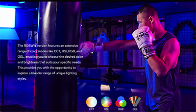 Versiunea RGBWW ofera o gama larga de moduri de culoare, cum ar fi CCT, HSI, RGB si GEL, permitandu-va sa alegeti culoarea si luminozitatea dorite pentru a se potrivi nevoilor dumneavoastra specifice. Acest lucru va permite sa explorati o gama mai larga de stiluri de iluminare unice.