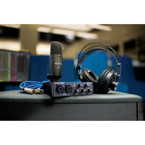 Presonus AudioBox USB 96 Studio - pachet pentru înregistrări audio, cu hardware și software necesar, compus din interfața audio AudioBox USB® 96 audio/MIDI, software-ul de producție audio Studio One 5 Artist și Studio Magic Plug-in Suite, microfonul condenser cu diafragmă mare M7, și căștile profesionale de monitorizare HD7, cabluri de conectică pentru microfon și interfața audio, toate marca Presonus. Este ideal pentru înregistrări multitrack, demo-uri, înregistrări live, podcast-uri, înregistrări de tip field, aplicații video și multe altele.