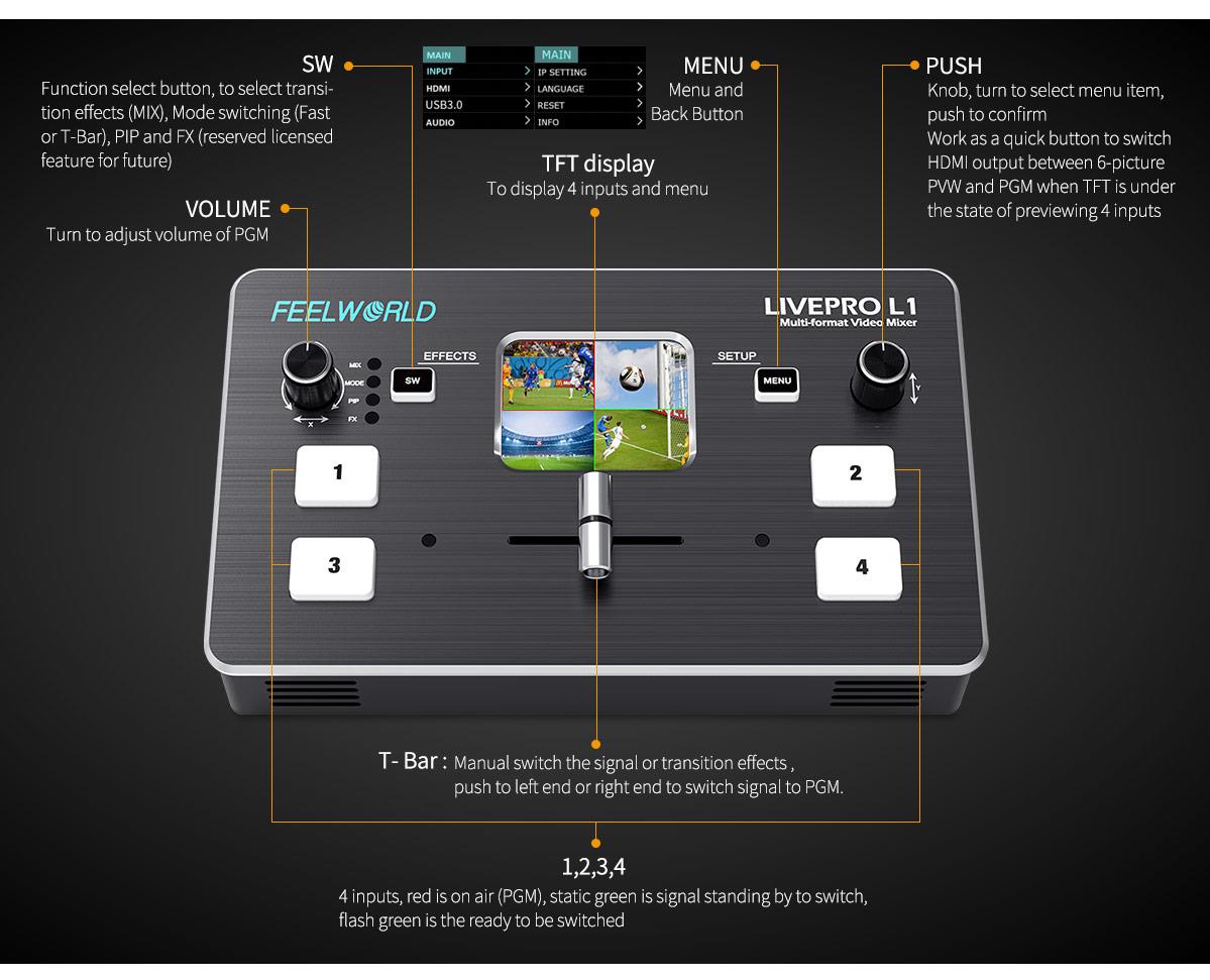 Feelworld LIVEPRO L1 este un mixer video tip plug & play ce ofera posibilitatea monitorizarii simultana pe ecran a camerelor.