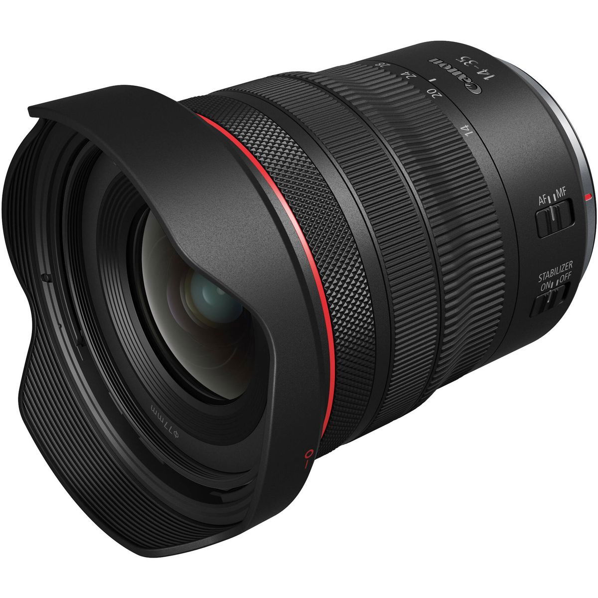 Canon RF 14-35mm dispune de un inel personalizabil de control al obiectivului pentru reglarea fina instantanee a sensibilitatii ISO sau a deschiderii diafragmei ori pentru schimbarea modului de focalizare automata.