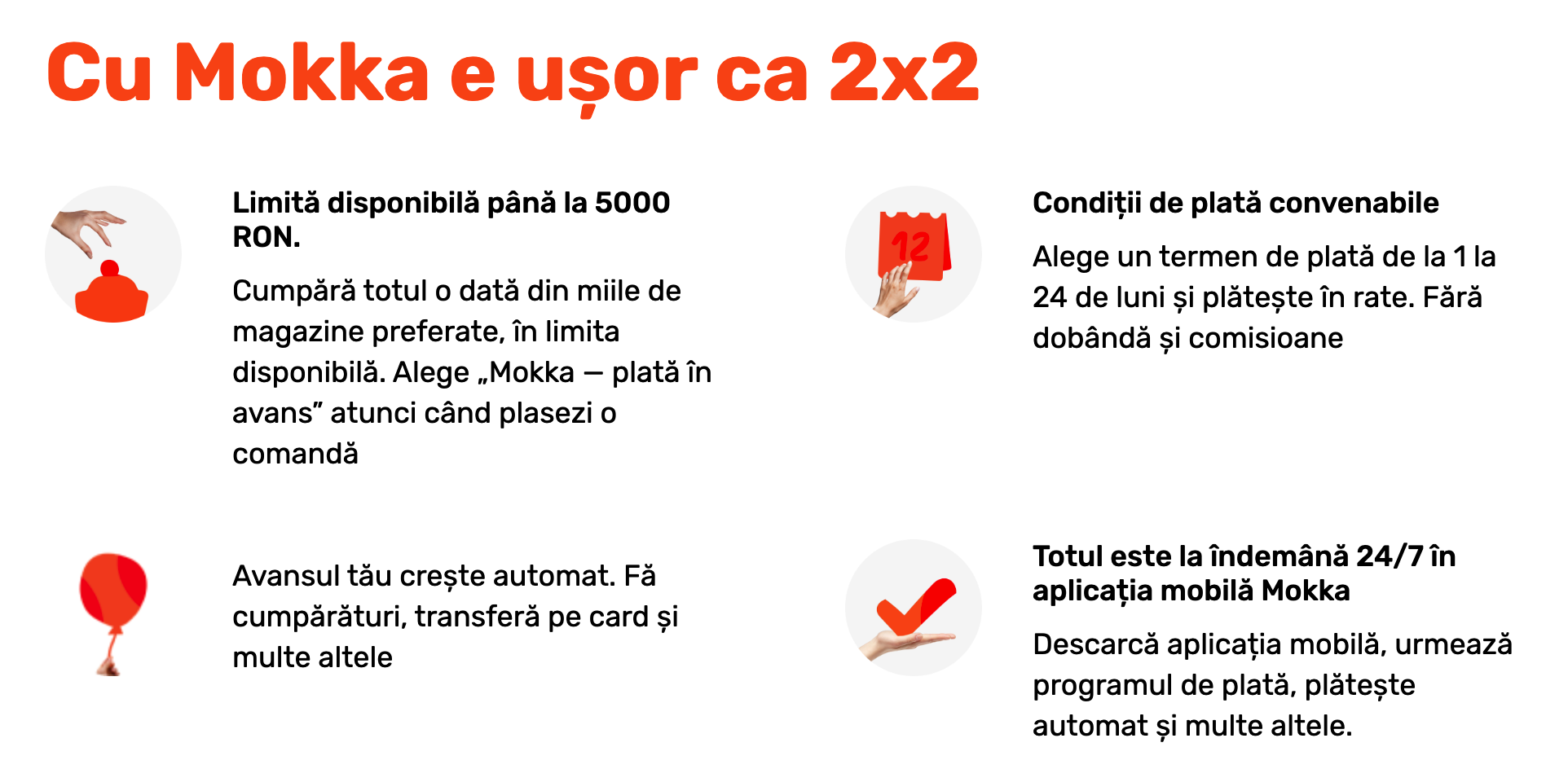 Mokka este o metoda de finantare bazatÄ pe modelul "Cumperi acum, Platesti mai tarziu", prin care poti sa achizitionezi produse din magazinul online Photosetup.ro pana la 5000Lei si sa platesti in rate egale pe parcursul a 24 luni, fara a detine un card de rate.