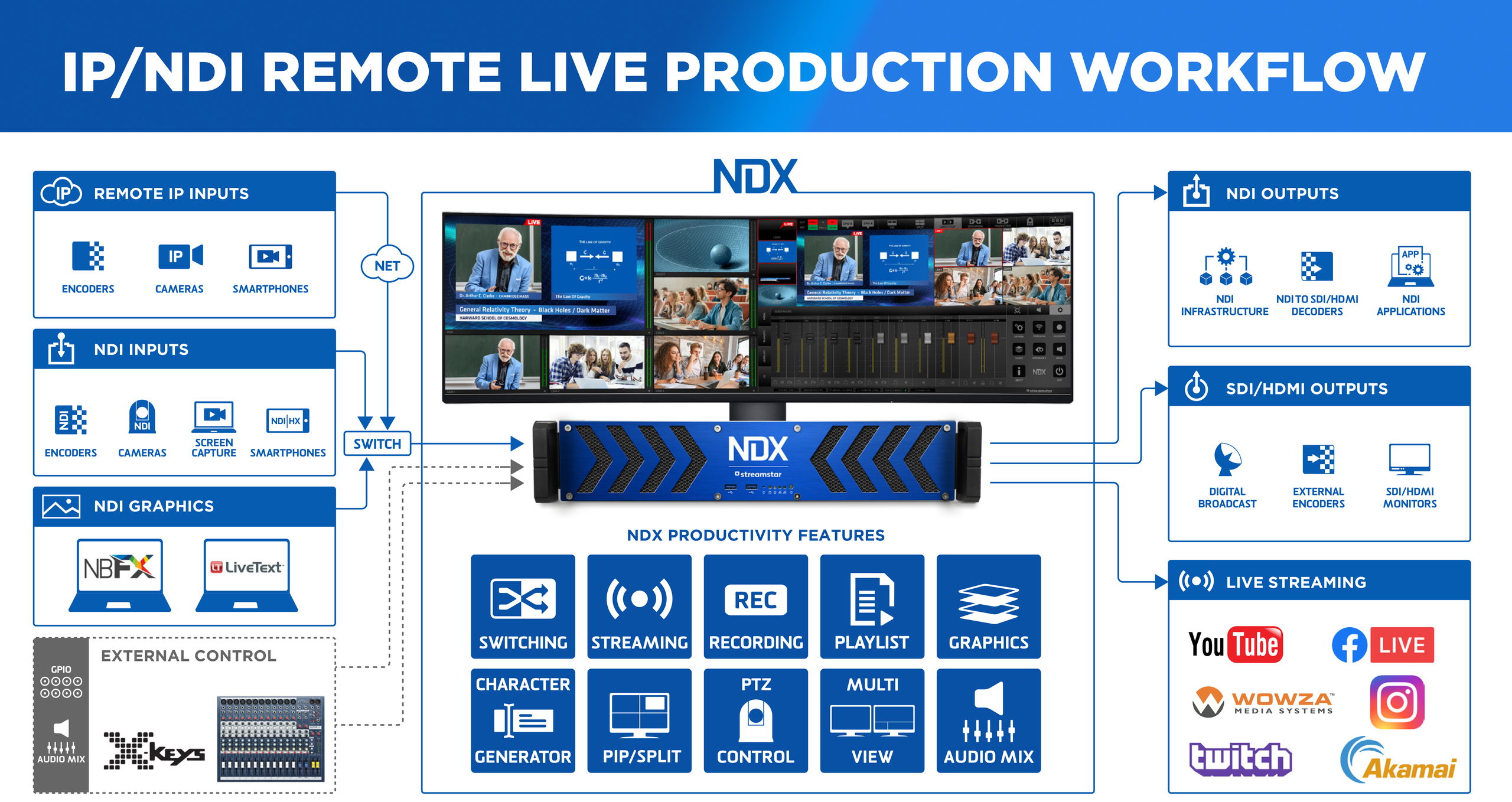 Streamstar NDX este cel mai nou sistem de live streaming multicam lansat pentru a oferi posibilitatea corporatiilor, scolilor sau intitutiilor ce nu dispun de pregatire tehnica in domeniul televiziunii, sa realizeze transmisii live multicam pana la 4 camere, intr-un mod simplu dar foarte complex.